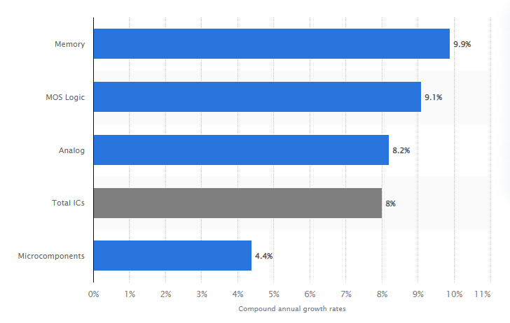 According to a report by Statista, In comparison to other products, the revenues for memory and MOS logic products are forecast to experience the most rapid growth during that time with CAGRs of over nine percent expected between 2020 and 2025.