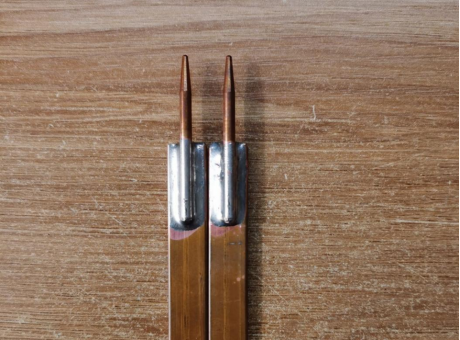 Cut a piece of 3x10mm copper bar (leftover from the previous spot welder project, already oxidized). Also, split the welding needle in half from the middle, using inexpensive ones.