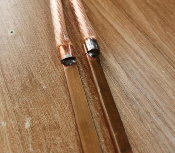 Applied the same process to the other end: wrapped it with copper tape to prevent the wire from spreading out, then soldered it.