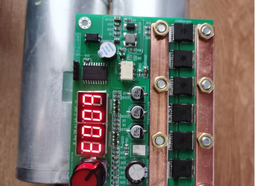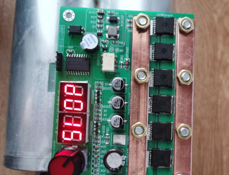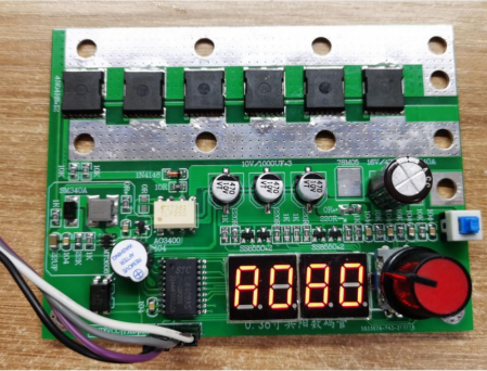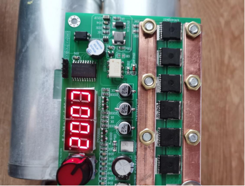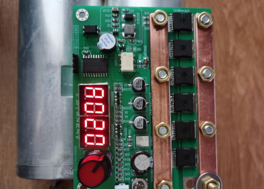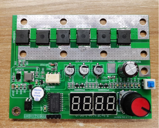 The PCB design is double-sided, with six MOSFETs on each side. The display remains the same as the previous version, utilizing a 4-digit LED display, with the addition of a buzzer.
