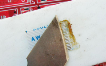 Align the ribbon cable with the PCB, hold it down with a knife, and then solder it.
